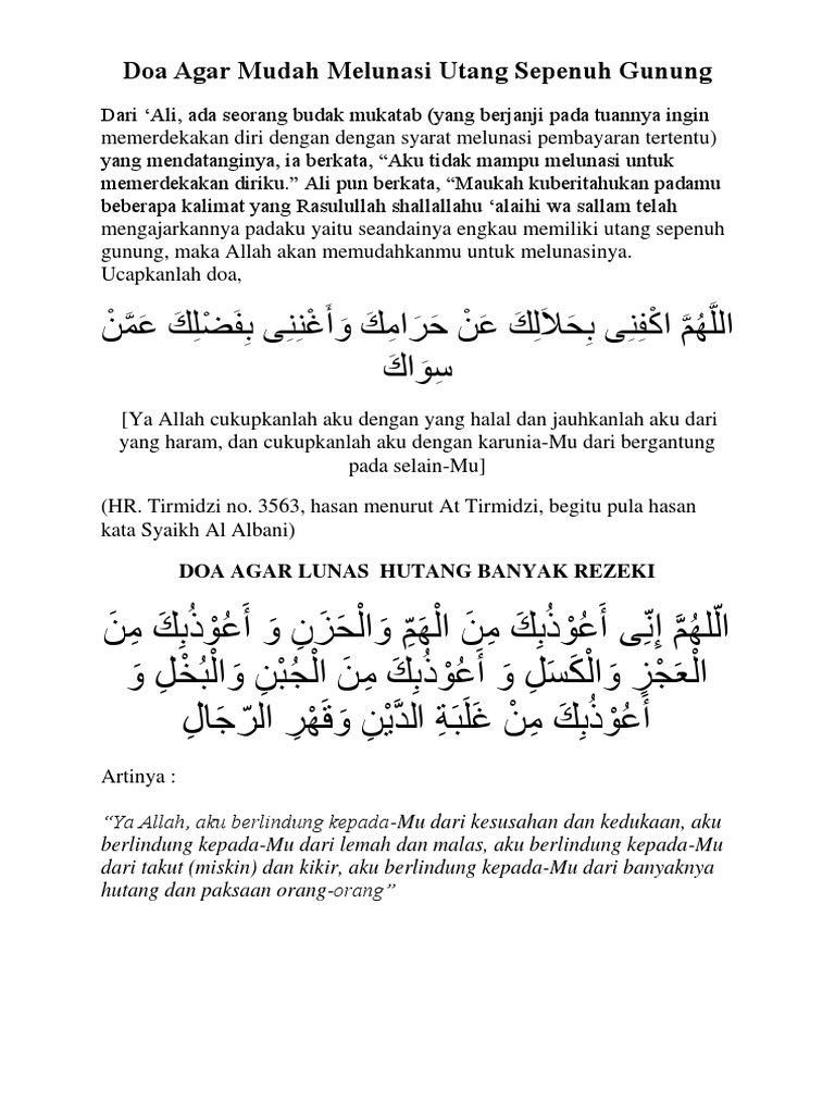 Dan berikut adalah doa dari rasulullah kepada sahabatnya yang sedang bingung untuk melunasi hutangnya. Amalan ini bisa and abaca rutin setiap hari sebagai doa. Karena alquran sendiri menjadi sumber ajaran pertama dan utama dalam syari'at islam. Sebenarnya banyak metode untuk melunasi hutang, ada yang menyikapinya dengan gali lobang tutup lobang. Berikut ini doa yang diajarkan rasulullah shallallahu 'alaihi wasallam yang fadhilahnya memudahkan kita. Dalam sebuah hadits yang diriwayatkan abu dawud, rasulullah juga pernah mengajarkan doa agar terbebas dari lilitan utang. Doa melunasi hutang segunung ini bisa jadi amalan yang mampu meringankan beban hutang kita. Maka dari itu, hindarilah berhutang dengan doa anjuran rasulullah saw berikut. Doa pelunas hutang merupakan sebuah aplikasi islami yang berisi tentang doa mustajab agar cepat bayar hutang lunas lengkap arab, latin dan artinya. Baik rezeki dari hasil usaha maupun pertolongan orang lain. Terdapat doa yang pernah diajarkan rasulullah saw kepada seorang sahabat anshar. Maka dari itu, sangat penting untuk mengetahui doanya. Doa melunasi hutang ini adalah doa yang diajarkan oleh rosulullah dulu.